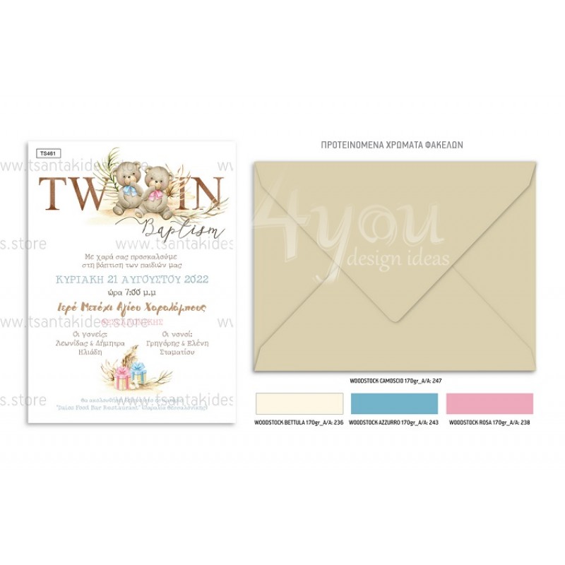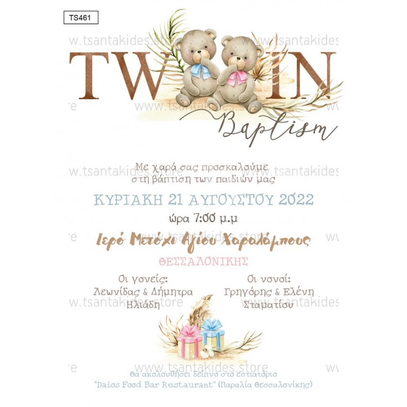 Προσκλητήριο βάπτισης για δίδυμα με θέμα Twin Bears