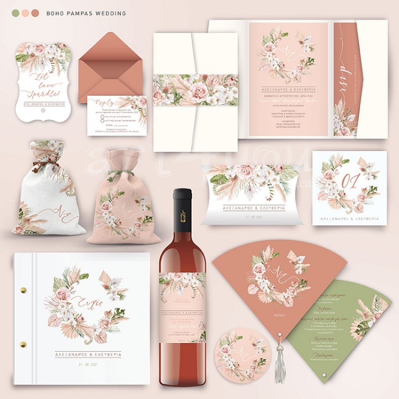 Διαθέσιμα είδη: Βιβλίο ευχών, Σουπλά, Λωρίδα μονόφυλλο, Κουτάκια με τυπωμένο το θέμα, Βεντάλια, Πουγκάκια,