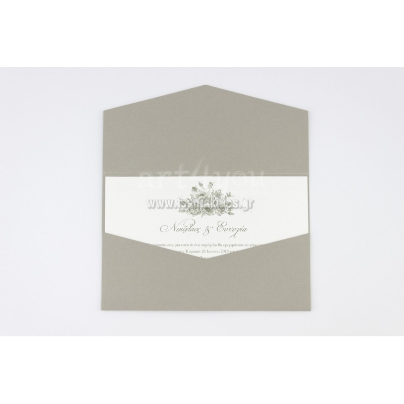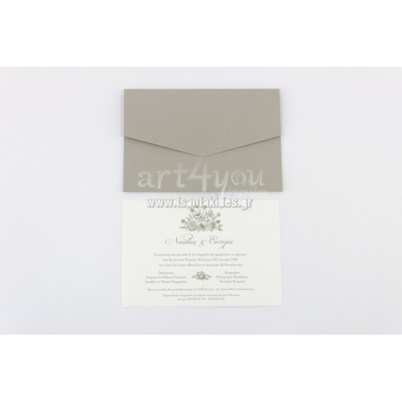 Το προσκλητήριο διαθέτει φάκελο σε ιδιαίτερο γκρι ματ χαρτί 250γρ.