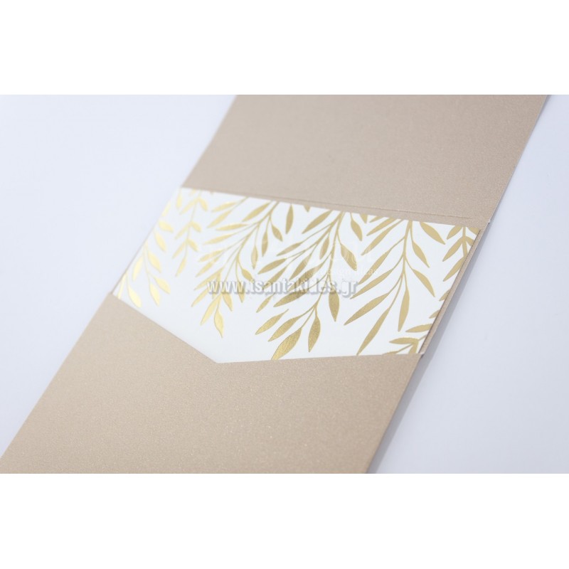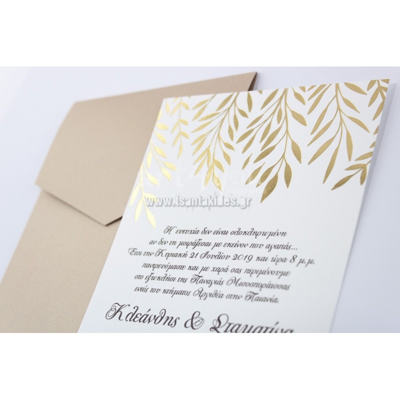 Elegant, chic προσκλητήριο γάμου, με συνδυασμό εκτύπωσης και χρυσοτυπίας των φύλλων στο επάνω μέρος της εσωτερικής κάρτας.