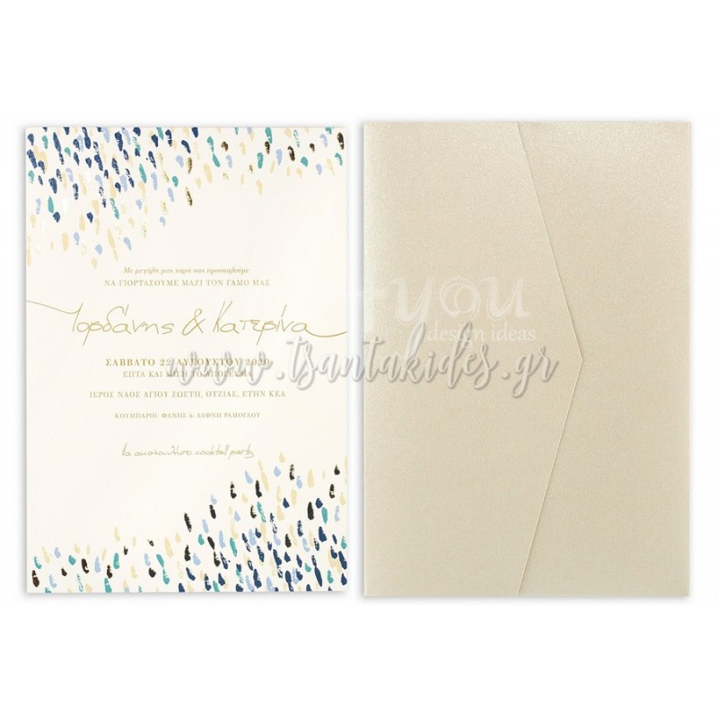 Το προσκλητήριο διαθέτει φάκελο διάστασης 22×15cm σε ιβουάρ περλέ χαρτί 300γρ.