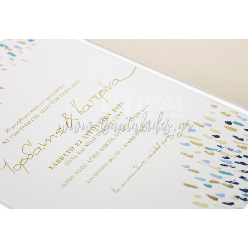 Προσκλητήριο γάμου με πινελιές σε dusty blue αποχρώσεις και λεπτομέρειες χρυσοτυπίας.