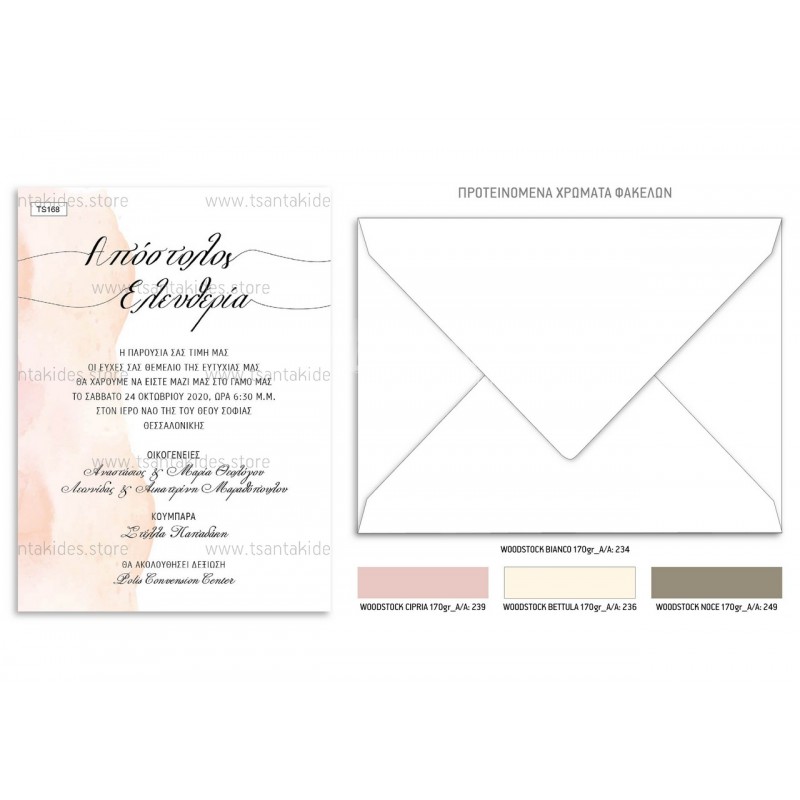 Το προσκλητήριο διαθέτει φάκελο διάστασης 19,5x14,5cm σε χαρτί της επιλογής σας από τους αναγραφόμενους κωδικούς.