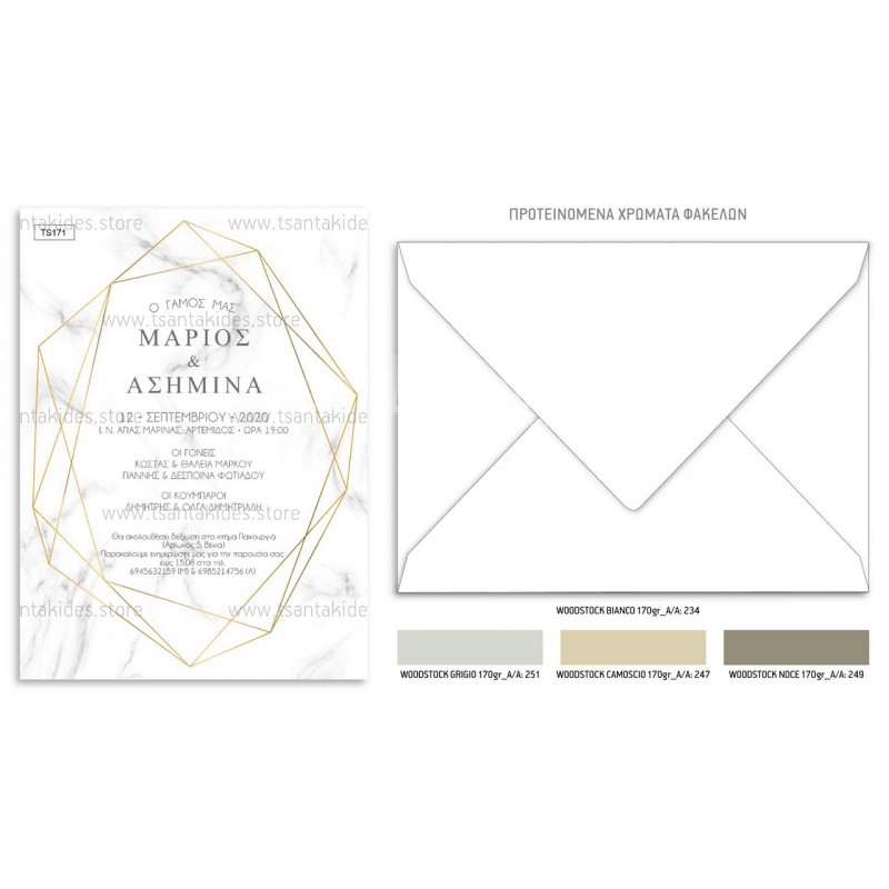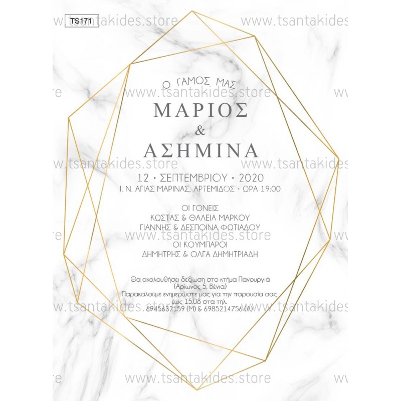 Προσκλητήριο γάμου με γραμμικό σχεδιασμό και background σε στυλ μάρμαρου.