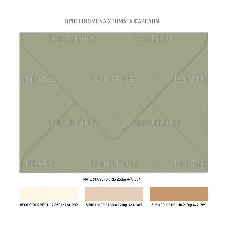 Το προσκλητήριο διαθέτει φάκελο διάστασης 19,5x14,5cm σε χαρτί της επιλογής σας από τους αναγραφόμενους κωδικούς.