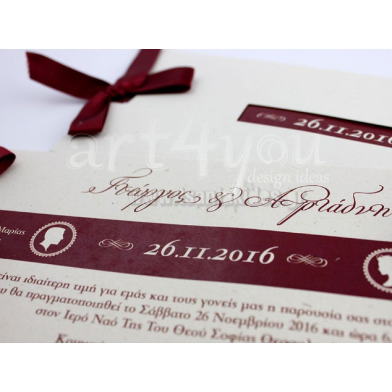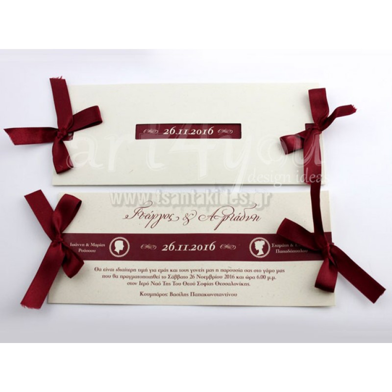 Στην τιμή δεν περιλαμβάνετε οι κορδέλες, αν επιθυμείτε να αγοράσετε το προσκλητήριο όπως στην φωτογραφία (ενδέχετε οι κορδέλες να μην είναι ακριβώς οι ίδιες λόγω έλειψης διαθεσιμότητας) παρακαλώ επικοινωνήστε μαζί μας.