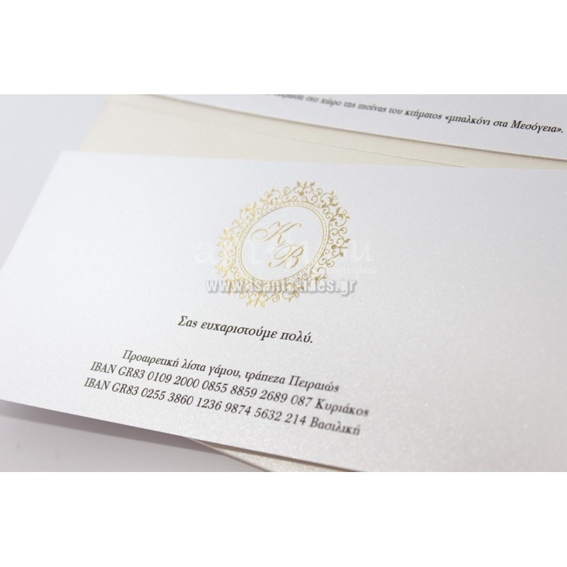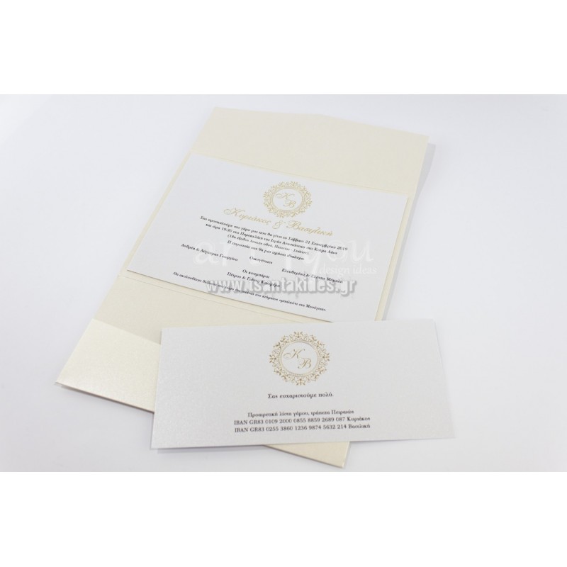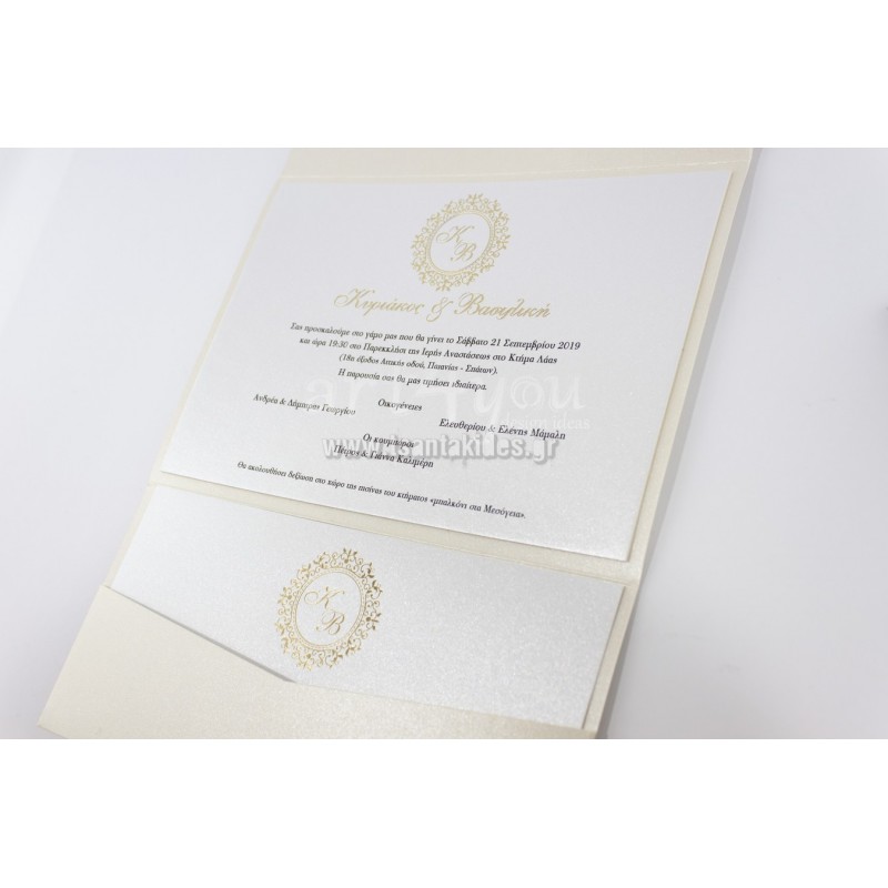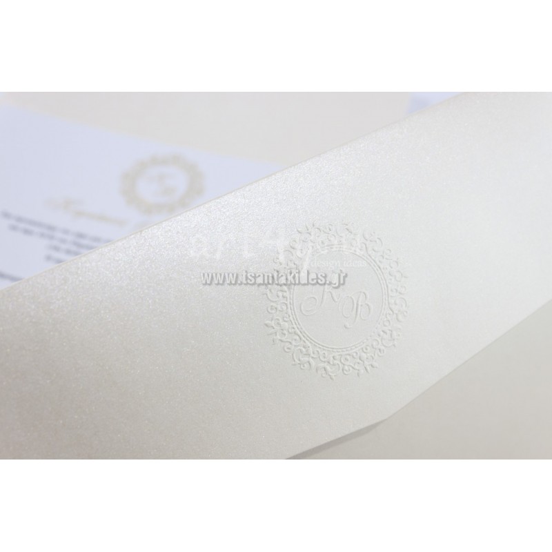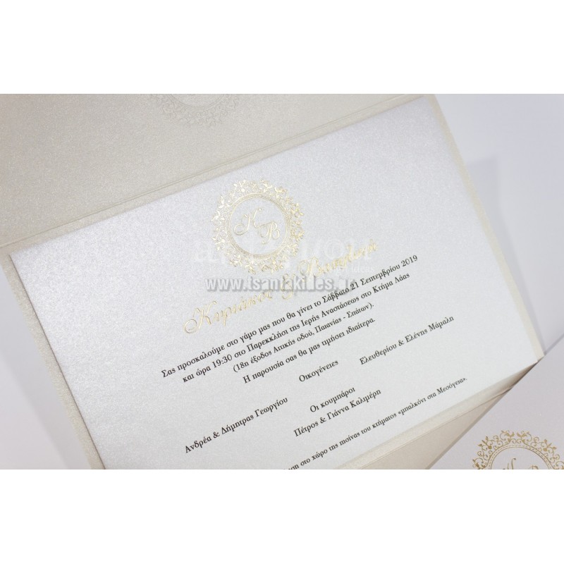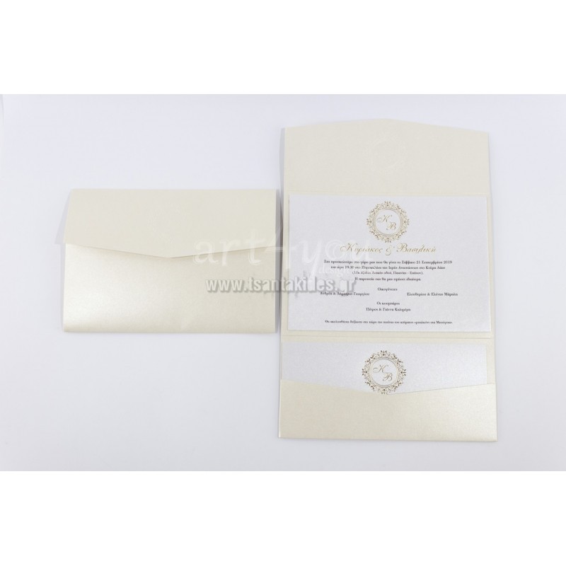 Elegant προσκλητήριο γάμου με ιδιαίτερες chic λεπτομέρειες. Ο συνδυασμός εκτύπωσης, χρυσοτυπίας και η ανάγλυφη απεικόνιση των μονογραμμάτων μέσα σε στεφανάκι στο εξωτερικό μέρος του φακέλου προσδίδουν στο προσκλητήριο επιπλέον κομψότητα και αριστοκρατικό ύφος. Το προσκλητήριο διαθέτει τρίπτυχο φάκελο σε χαρτί πολυτελείας ιβουάρ περλέ 300γρ διάστασης 17×27 cm με τσέπη για την κάρτα δεξίωσης. Η κεντρική κάρτα του προσκλητηρίου, διάστασης 23×16 cm και η κάρτα της δεξίωσης, διάστασης 23×10,5 cm, είναι τυπωμένες σε χαρτί πολυτελείας λευκό περλέ 300γρ και διαθέτουν χρυσοτυπία στο επάνω μέρος το στεφανάκι με τα μονογράμματα και τα ονόματα του ζευγαριού η πρώτη και το στεφανάκι με τα μονογράμματα η δεύτερη. Η κάρτα της πρόσκλησης είναι κατασκευασμένη με ειδική τεχνική τυπογραφίας ώστε να είναι άκαμπτη και είναι κολλημένη στο κύριο σώμα του φακέλου.