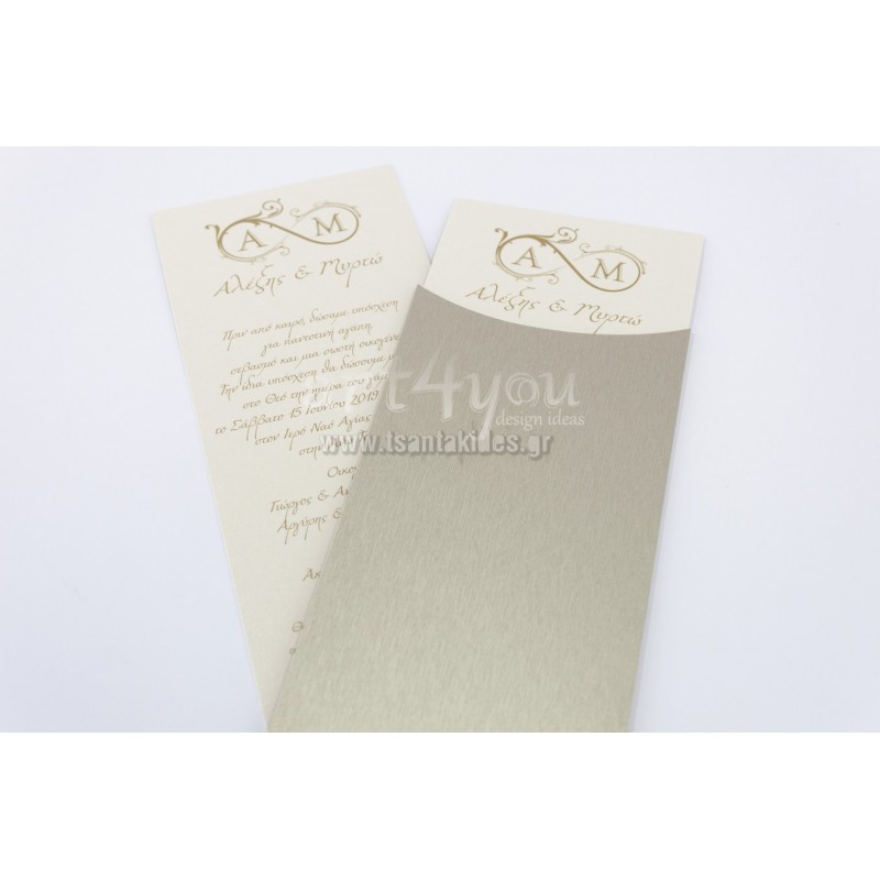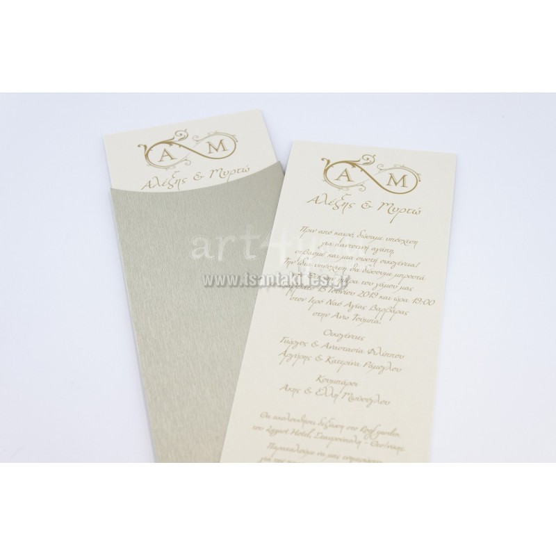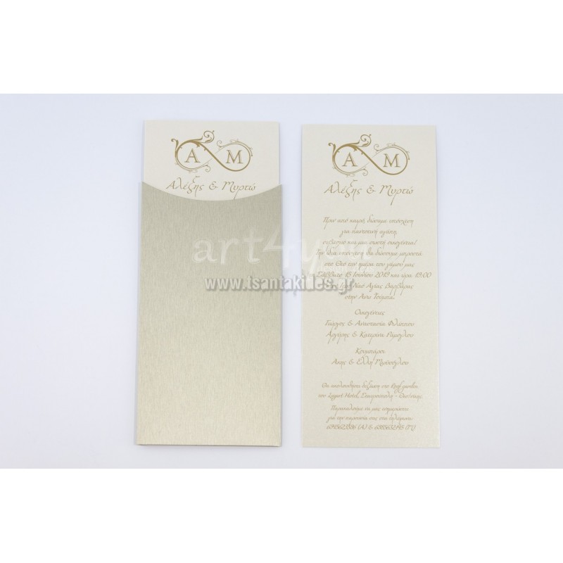 Προσκλητήριο γάμου σε ζεστούς χρωματισμούς με θέμα το σύμβολο του infinity. Το προσκλητήριο διαθέτει μακρόστενο συρταρωτό φάκελο από πολυτελή δερματίνη σαμπανιζέ απόχρωσης. Η διάσταση του φακέλου είναι 20.5Χ20cm. Η κάρτα του προσκλητηρίου διάστασης 10×25 cm είναι τυπωμένη σε ιβουάρ περλέ χαρτί 300γρ και προεξέχει του φακέλου.