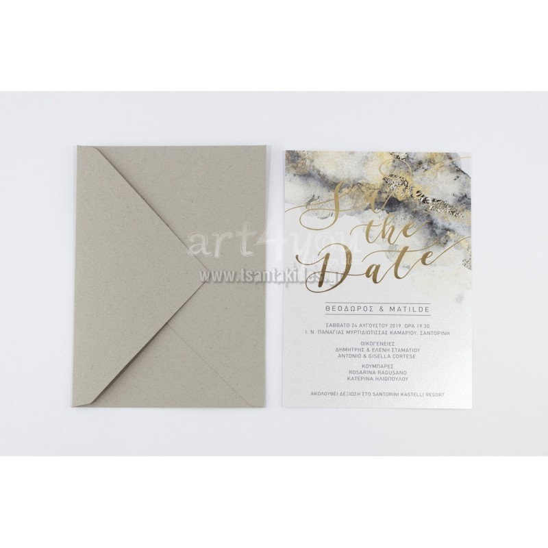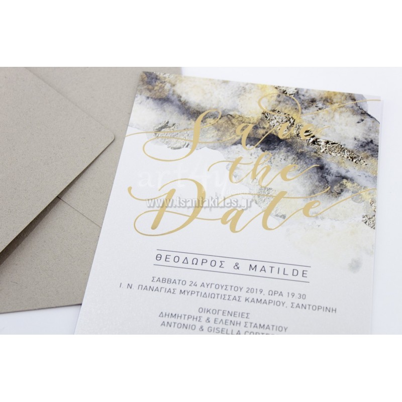 Εντυπωσιακό προσκλητήριο γάμου, με συνδυασμό εκτύπωσης και χρυσοτυπίας «Save the Date» στην εσωτερική κάρτα.