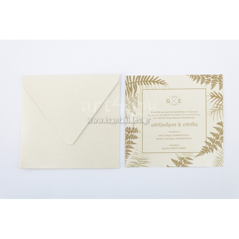 Προσκλητήριο γάμου σε γήινους ζεστούς χρωματισμούς με minimal φύλλα δέντρων περιμετρικά της πρόσκλησης.