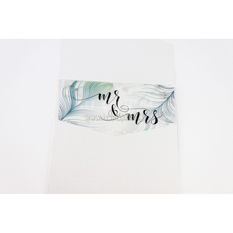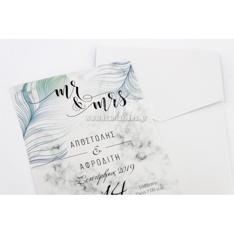 Εντυπωσιακό προσκλητήριο γάμου με μοντέρνα στοιχεία και design από μάρμαρο και τα φτερά από παγώνι.