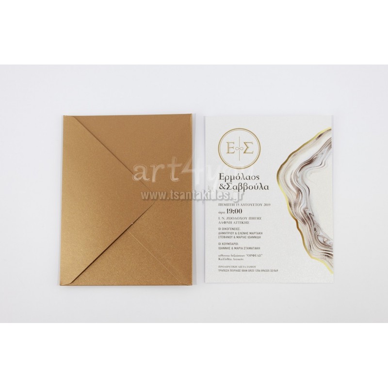 Το προσκλητήριο διαθέτει φάκελο σε μπρονζέ περλέ χαρτί 300γρ διάστασης 19,5Χ14,5cm.