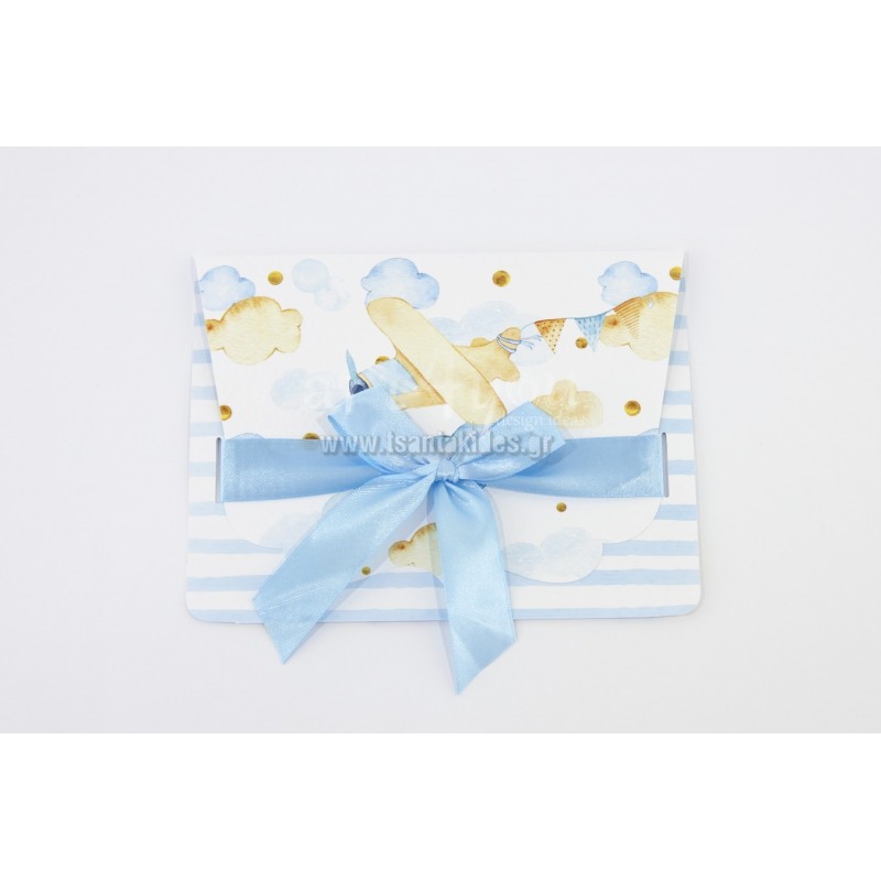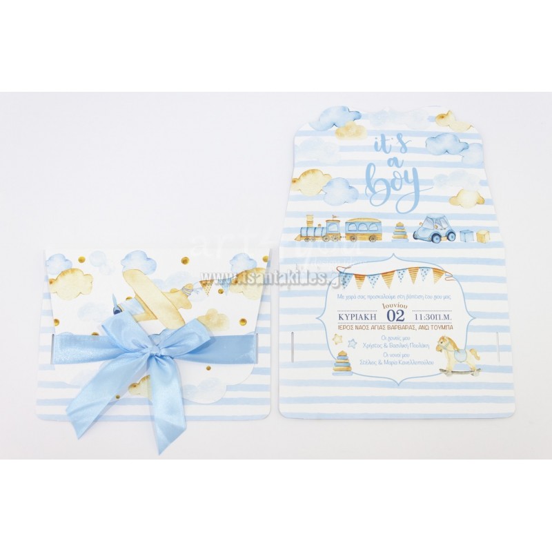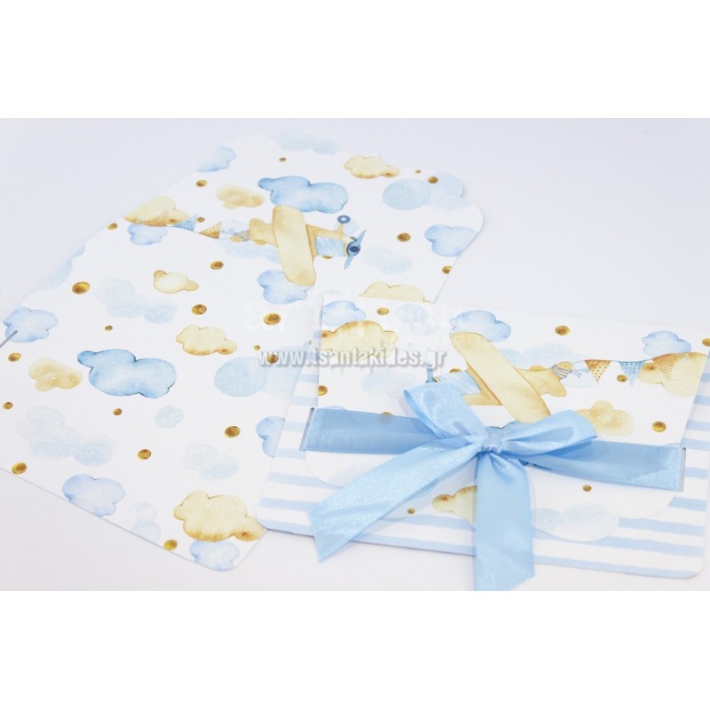 Προσκλητήριο βάπτισης για αγόρι με θέμα το αεροπλανάκι και τα παιδικά παιχνίδια σε παστέλ αποχρώσεις.