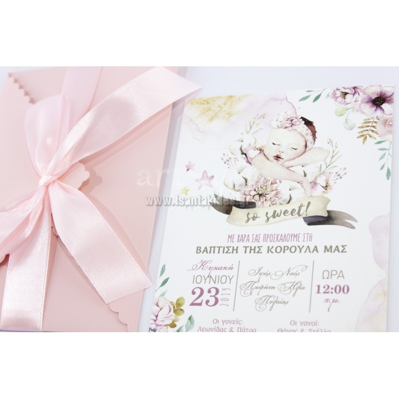 Το προσκλητήριο διαθέτει φάκελο διάστασης 17.5Χ12.5 cm σε ροζ ματ χαρτί 250γρ.
