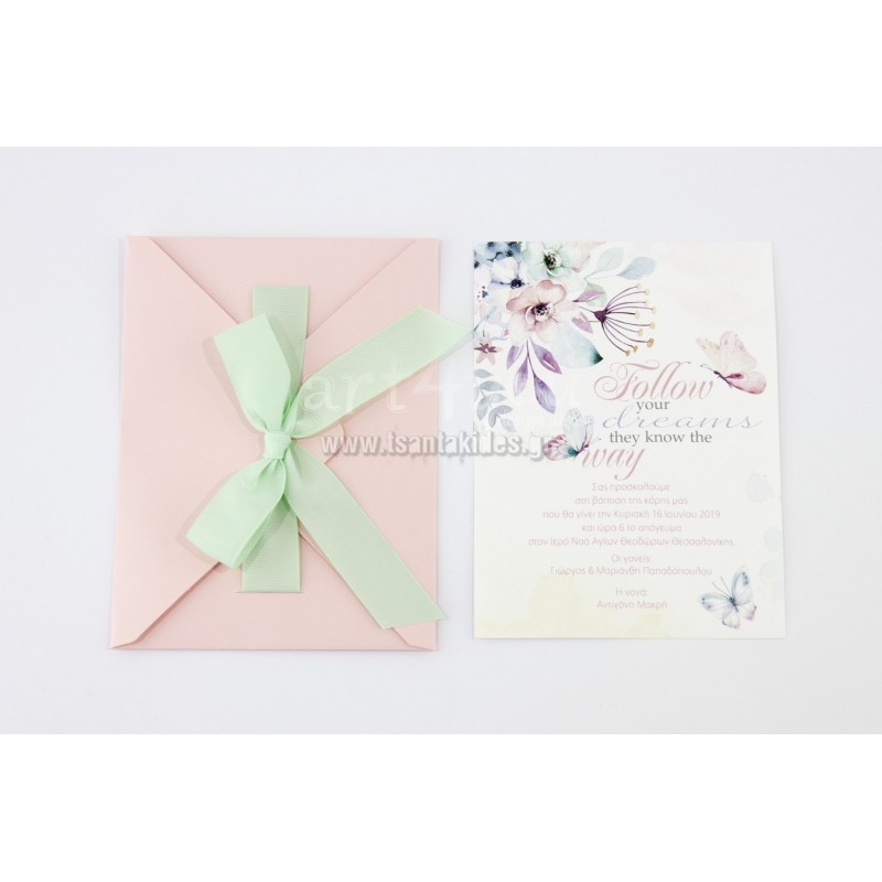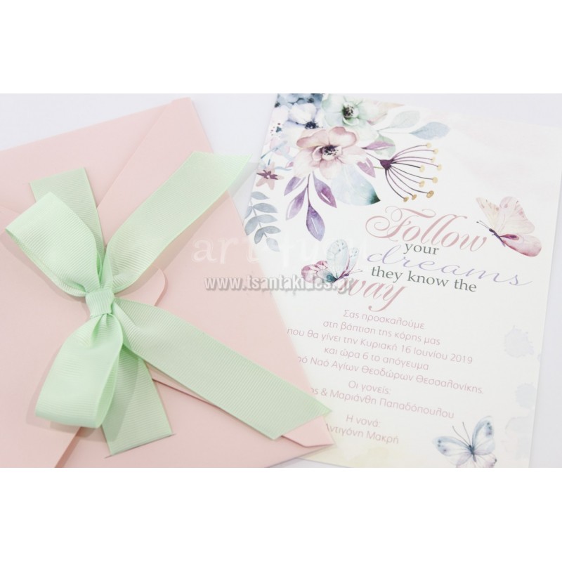 Προσκλητήριο βάπτισης για κορίτσι με θέμα τις πεταλούδες με φλοράλ στοιχεία.