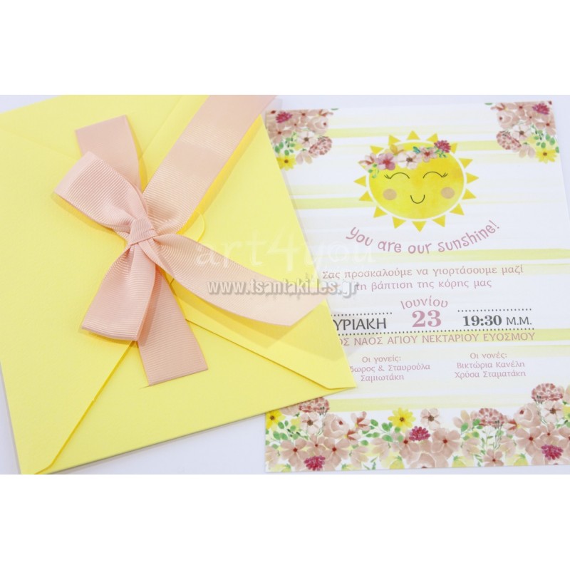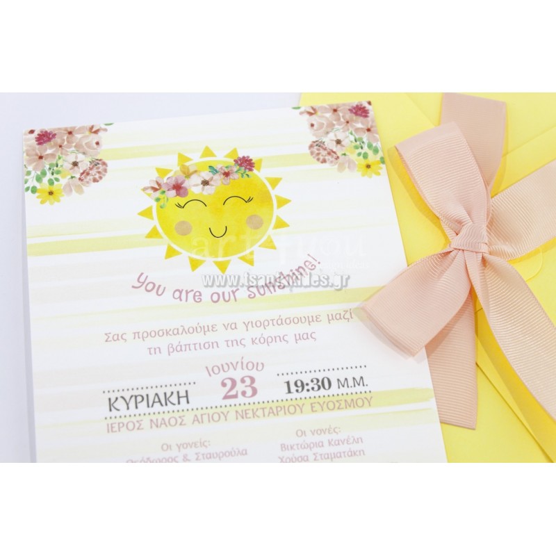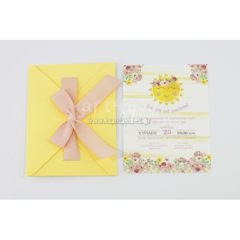 Προσκλητήριο βάπτισης για κορίτσι με θέμα τον ήλιο και μικρά λουλουδάκια περιμετρικά της κάρτας.