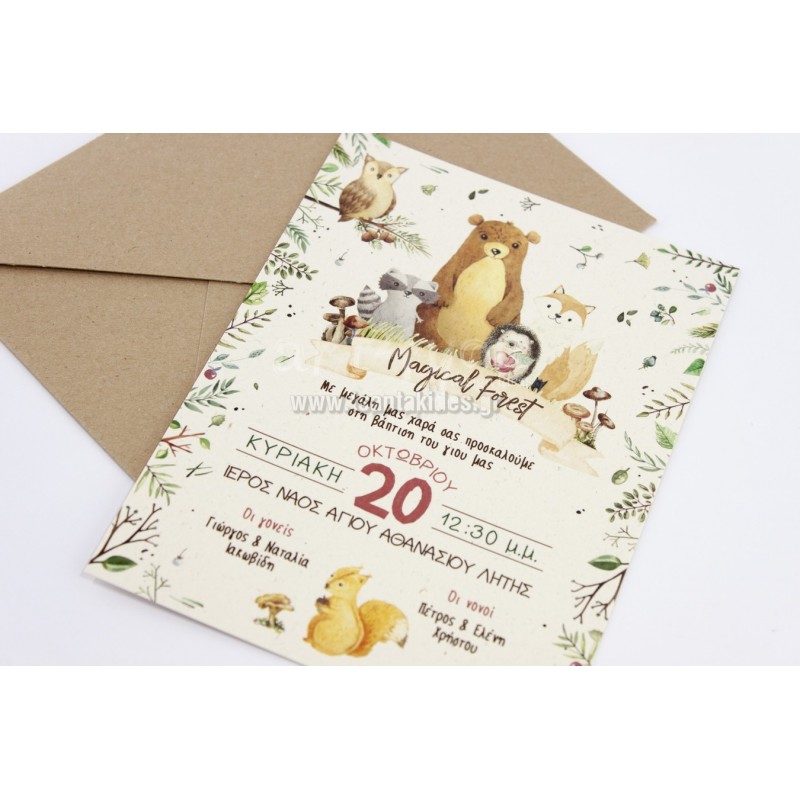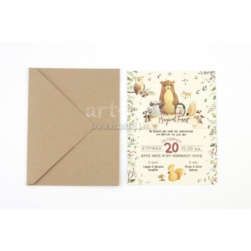 Προσκλητήριο βάπτισης για αγόρι με θέμα τα ζωάκια του δάσους σε γήινες αποχρώσεις.