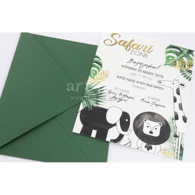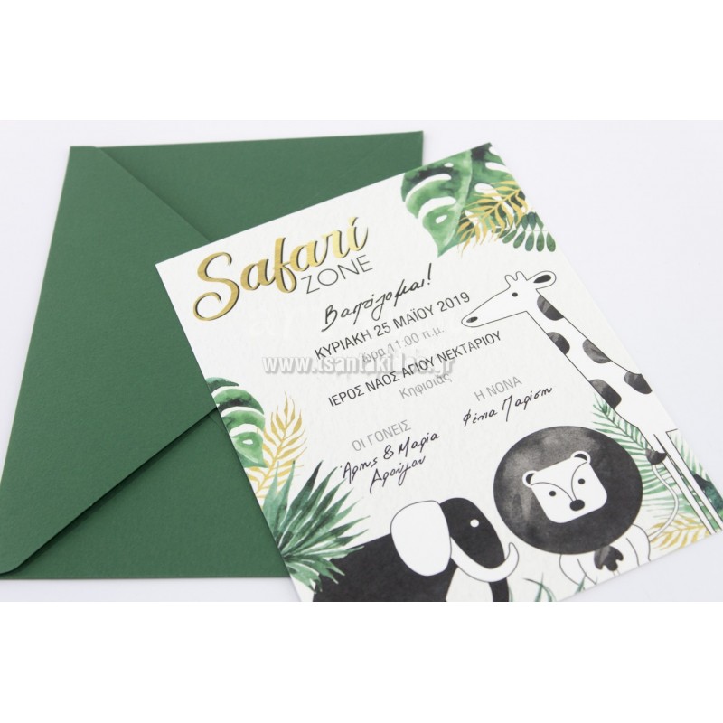 Προσκλητήριο βάπτισης για αγόρι με θέμα το safari και τα ζωάκια της ζούγκλας