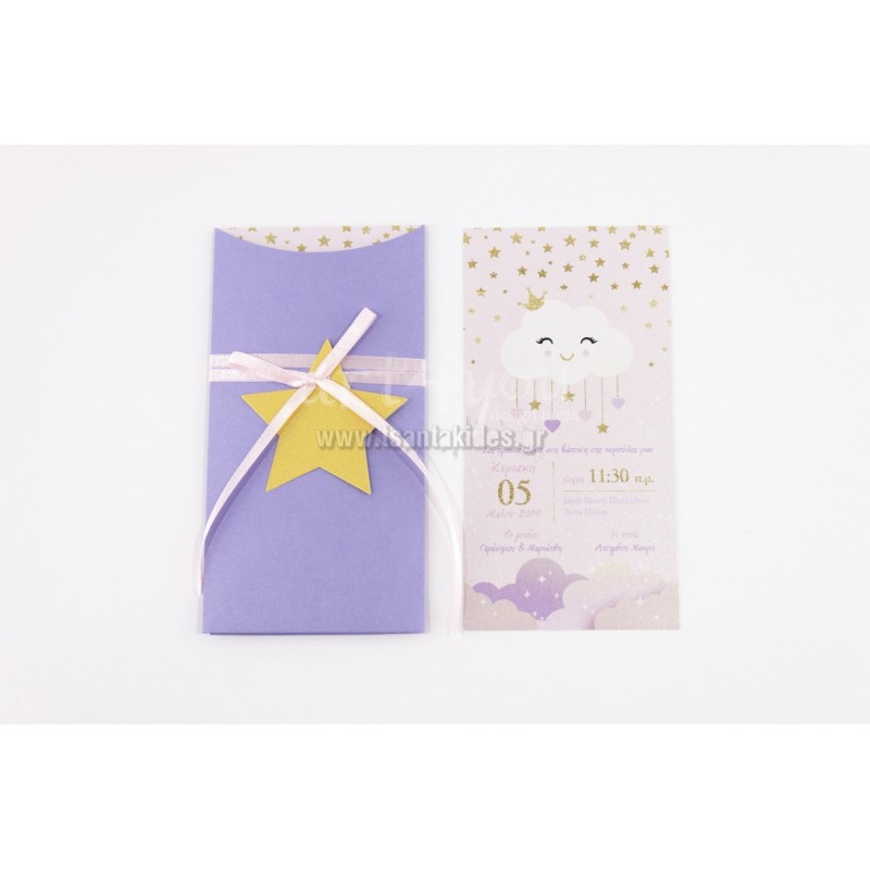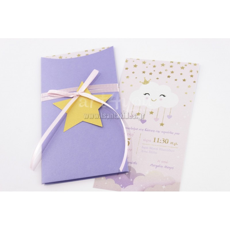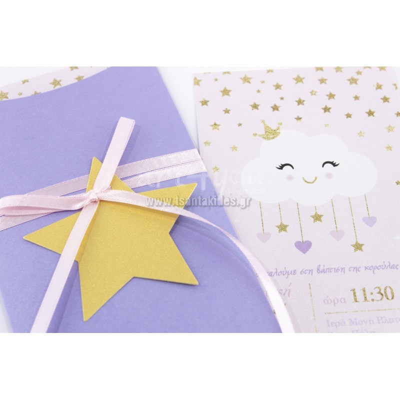 Προσκλητήριο βάπτισης για κορίτσι με θέμα το συννεφάκι και τα αστέρια σε ροζ, λιλά, αποχρώσεις.