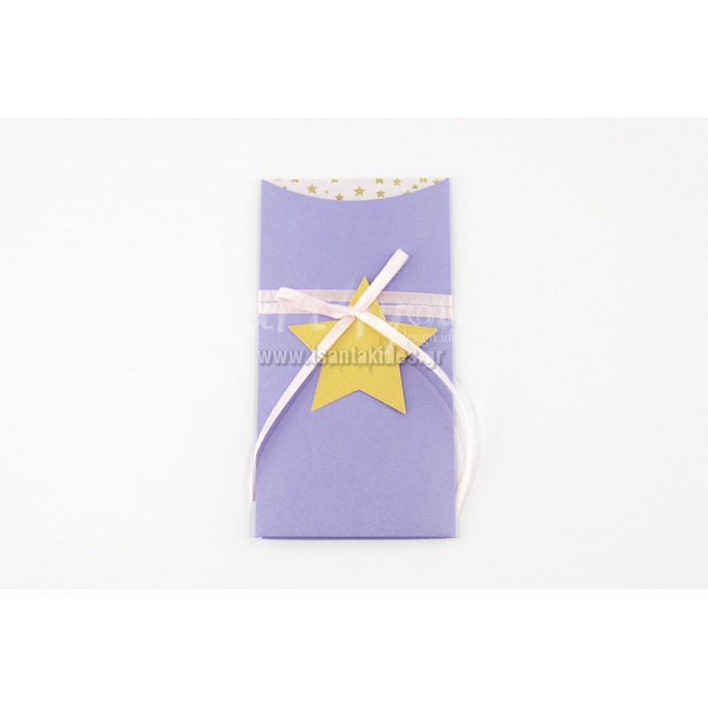 Το προσκλητήριο διαθέτει συρταρωτό φάκελο διάστασης 10.5Χ20 cm σε μοβ περλέ χαρτί 250γρ.