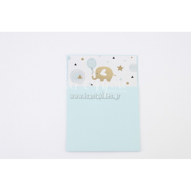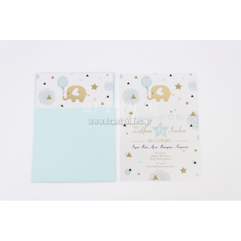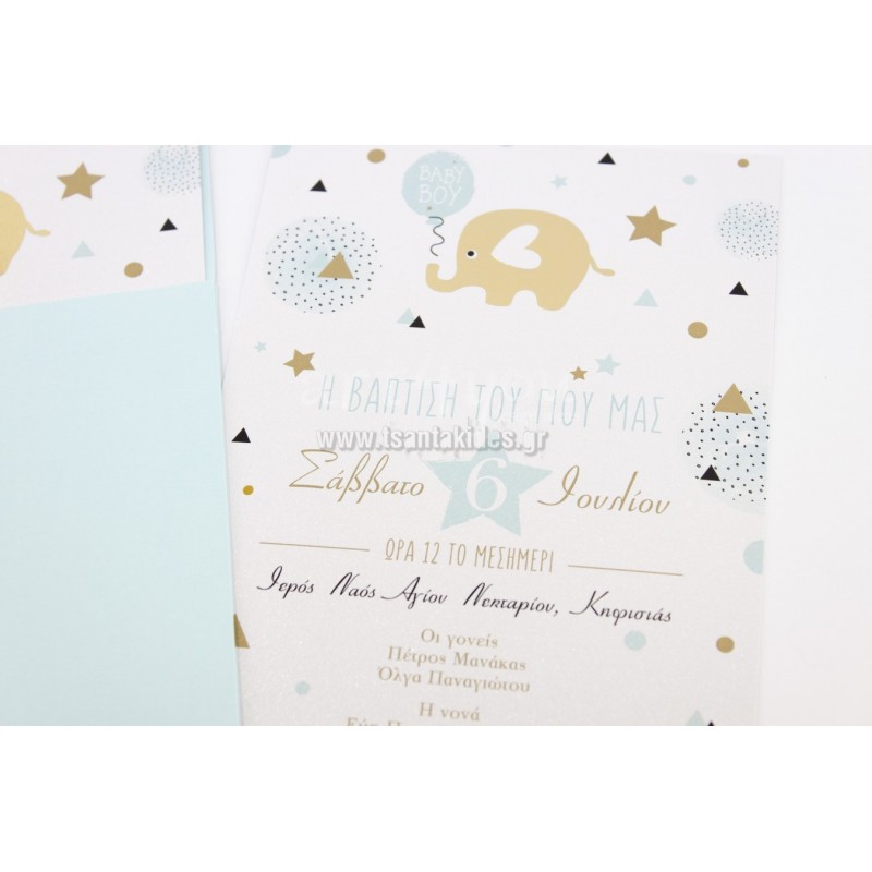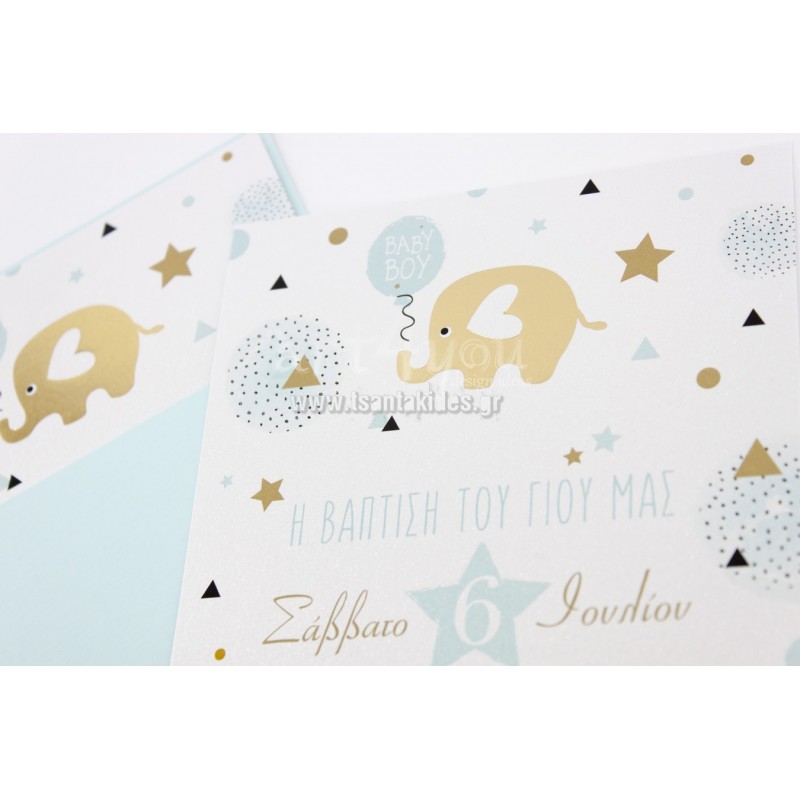 Προσκλητήριο βάπτισης για αγόρι με θέμα το ελεφαντάκι σε σιέλ, χρυσούς χρωματισμούς. Η κάρτα του προσκλητηρίου συνδυάζει εκτύπωση και χρυσοτυπία στο ελεφαντάκι σε λευκό περλέ χαρτί 300γρ