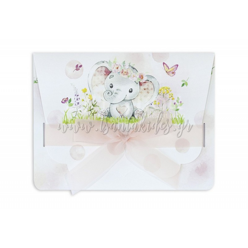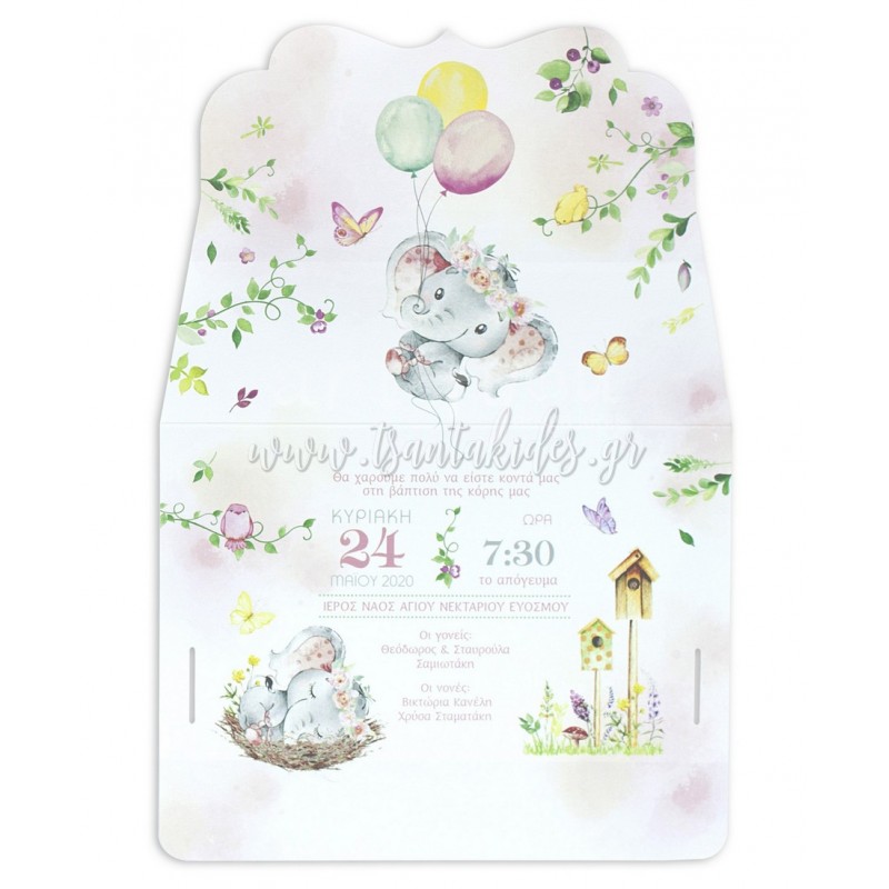 Προσκλητήριο βάπτισης για κορίτσι με θέμα το μικρό ελεφαντάκι σε ροζ παστέλ αποχρώσεις.