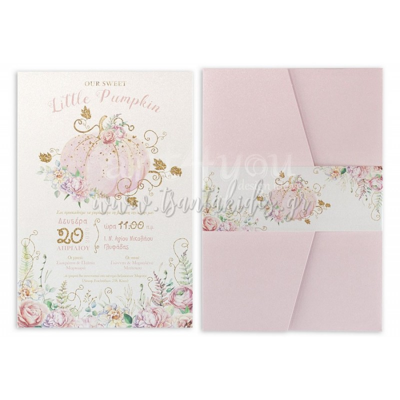 Προσκλητήριο βάπτισης για κορίτσι με θέμα την μικρή κολοκύθα σε ροζ παστέλ αποχρώσεις με φλοράλ μοτίβο.