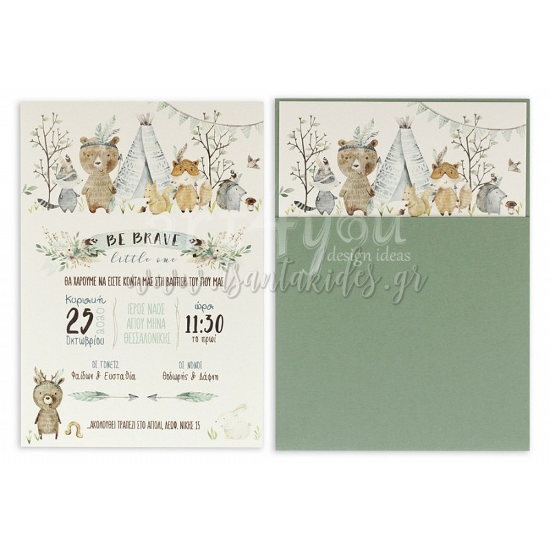 Προσκλητήριο βάπτισης για αγόρι με θέμα τα ζωάκια του δάσους.