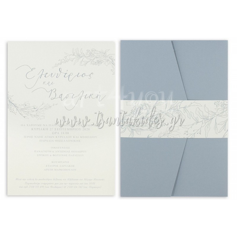 Το προσκλητήριο διαθέτει φάκελο διάστασης 22×15cm σε dusty blue ματ χαρτί 300γρ.