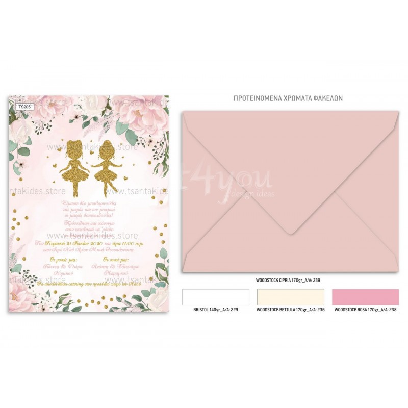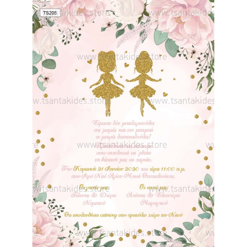 Προσκλητήριο βάπτισης για δίδυμα με θέμα τη μπαλαρίνα.