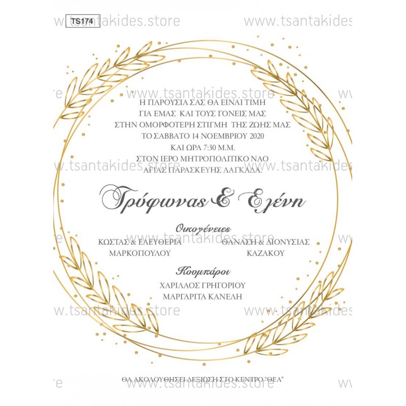 Προσκλητήριο γάμου με γραμμικό στρογγυλό στεφανάκι σε χρυσαφί αποχρώσεις