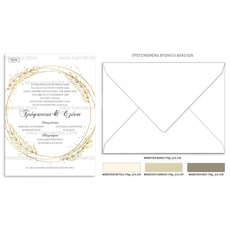 Προσκλητήριο γάμου στεφανάκι σε χρυσαφί αποχρώσεις