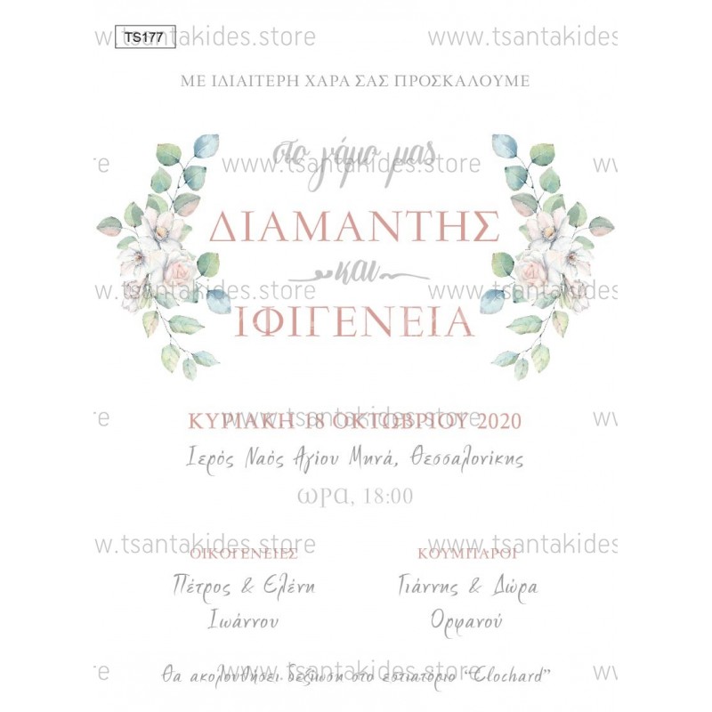 Προσκλητήριο γάμου με floral σχεδιασμό σε pastel χρωματισμούς.