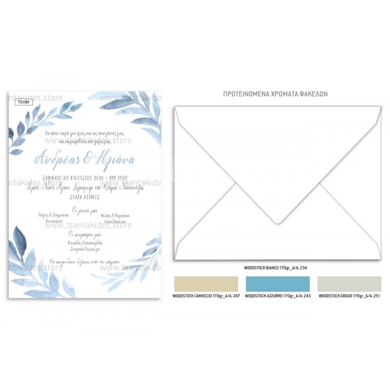 Προσκλητήριο γάμου με κλαδιά σιελ χρωματισμούς.