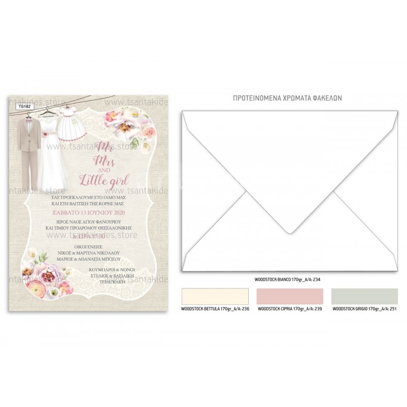 Το προσκλητήριο διαθέτει φάκελο διάστασης 19,5x14,5cm σε χαρτί της επιλογής σας από τους αναγραφόμενους κωδικούς.