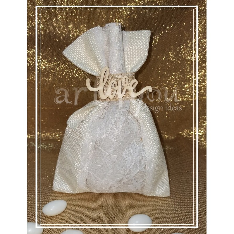 Μπομπονιέρα γάμου πουγκί λινάτσα με δαντέλα και ξύλινο Love.