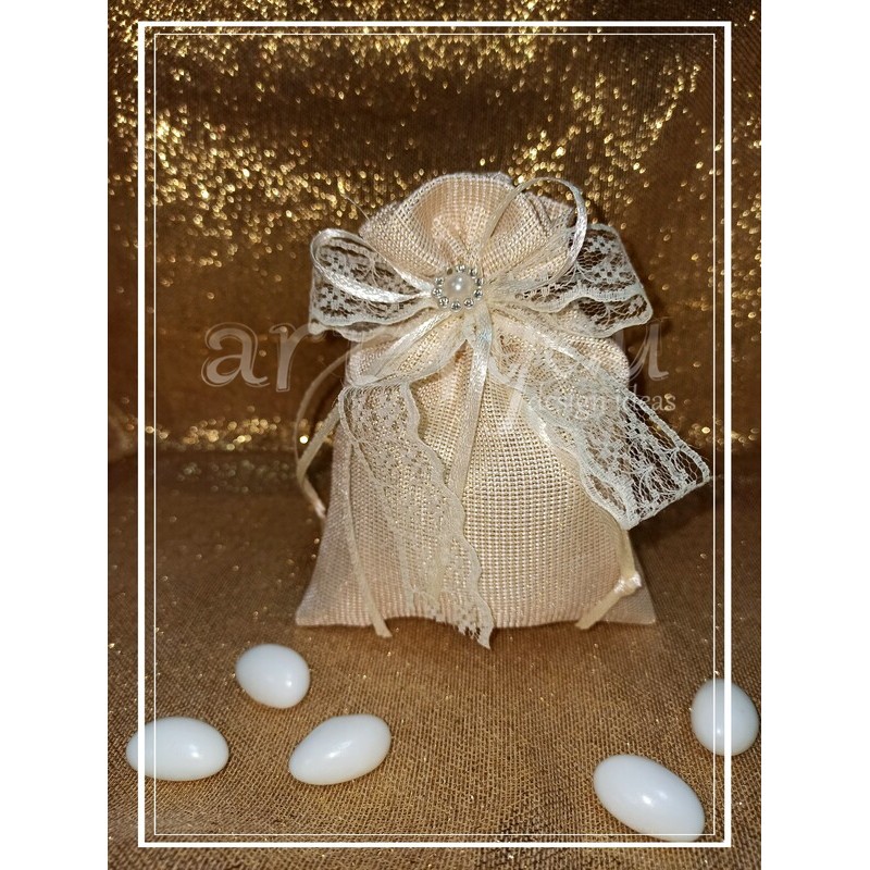 Μπομπονιέρα γάμου πουγκί με πέρλα στρας, διπλή κορδέλα και δαντέλα