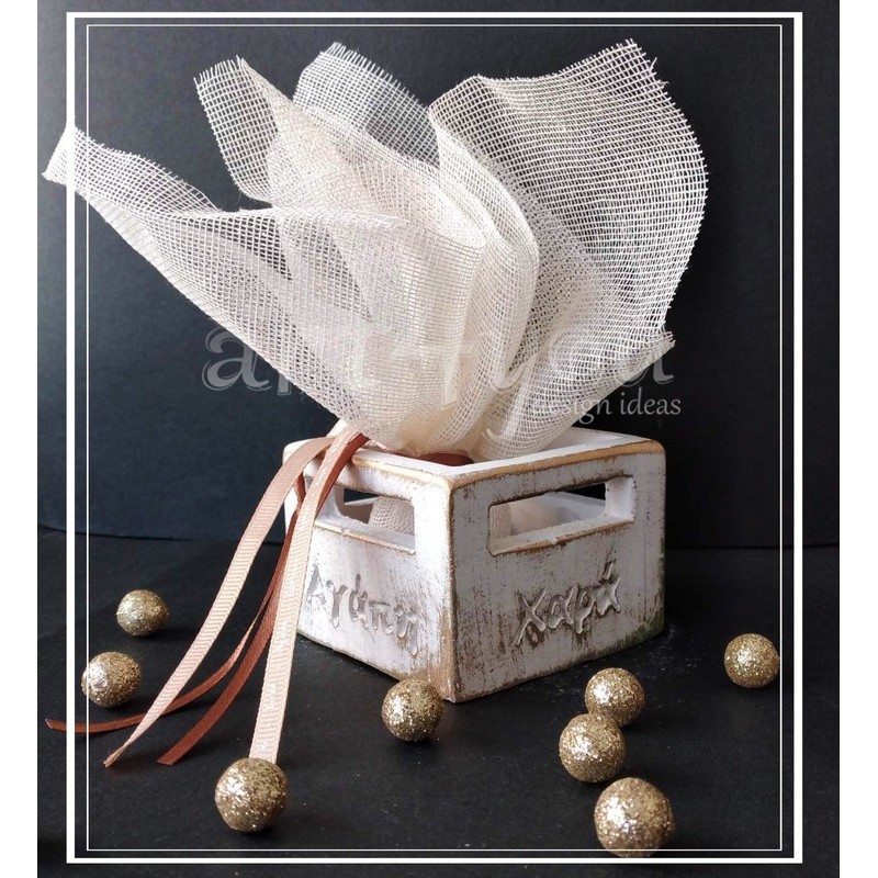 Μπομπονιέρα γάμου κεραμική βάση ρεσό με ευχές και γάζα