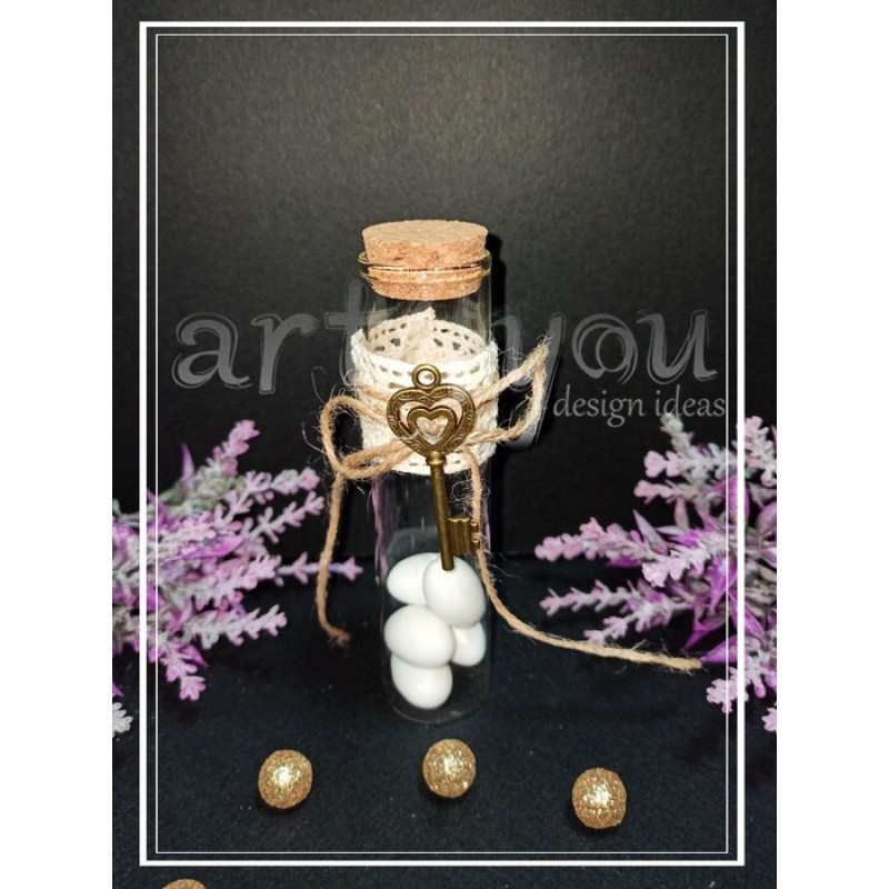 Μπομπονιέρα γάμου γυάλινος σωλήνας με φελό,κορδέλα δαντέλα βαμβακερή,