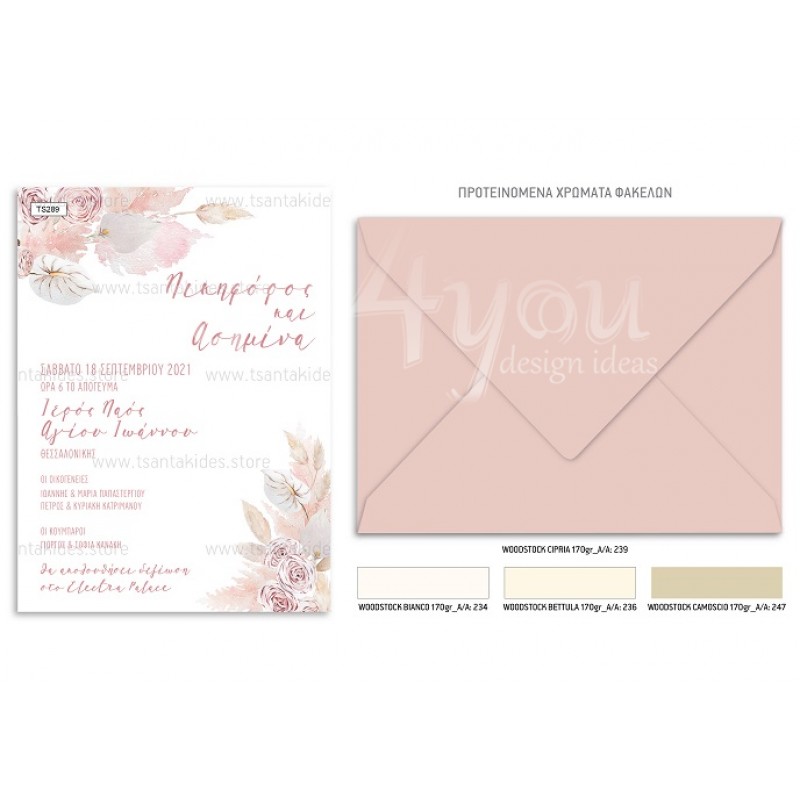Το προσκλητήριο διαθέτει φάκελο διάστασης 19,5x14,5cm σε χαρτί της επιλογής σας από τους αναγραφόμενους κωδικούς.