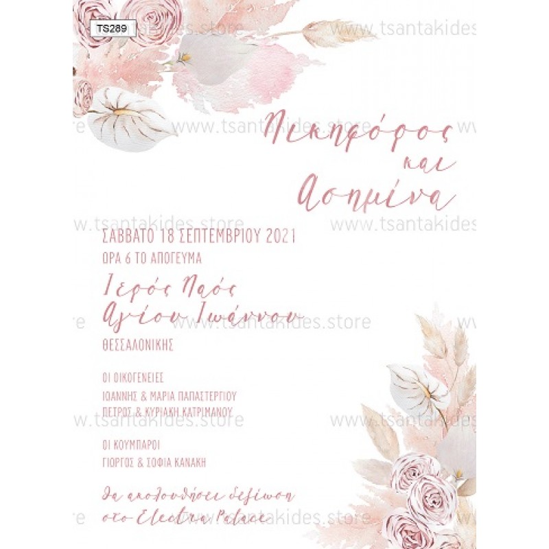 Προσκλητήριο γάμου με bohemian ύφος και pampas λουλούδια.