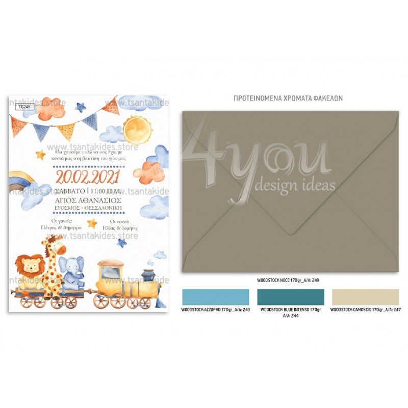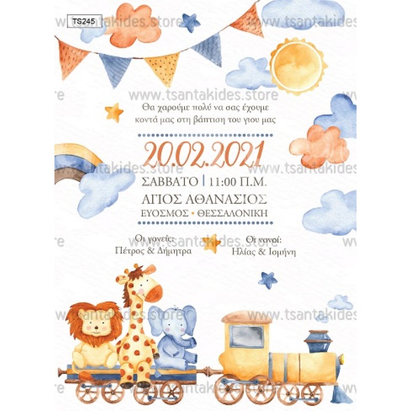 Προσκλητήριο βάπτισης για αγόρι με θέμα το τρενάκι και τα ζώα της ζούγκλας