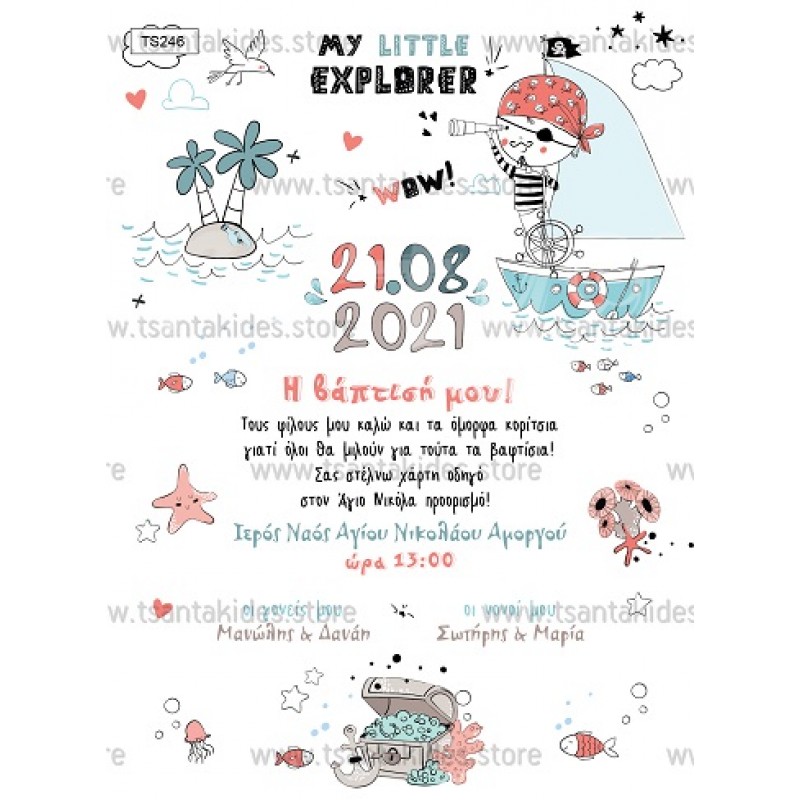 Προσκλητήριο βάπτισης για αγόρι με θέμα τον πειρατή.