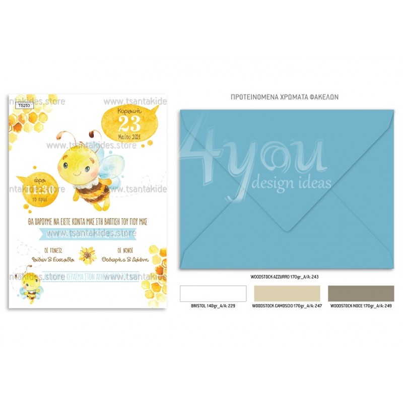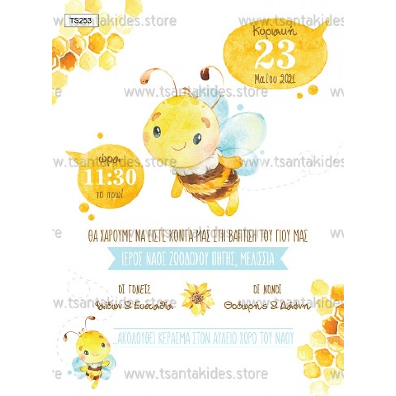 Προσκλητήριο βάπτισης για αγόρι με θέμα τη μέλισσα