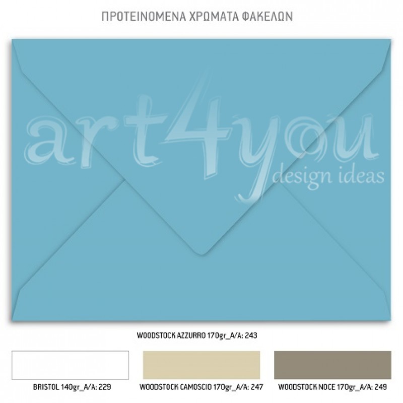 Το προσκλητήριο διαθέτει φάκελο διάστασης 19,5x14,5cm σε χαρτί της επιλογής σας από τους αναγραφόμενους κωδικούς.
