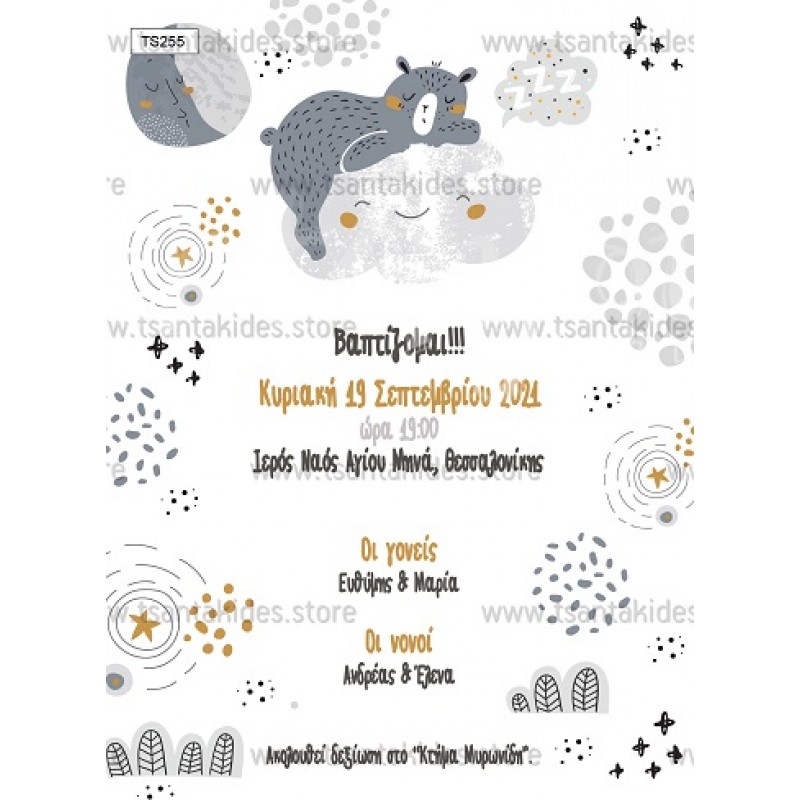 Προσκλητήριο βάπτισης για αγόρι με θέμα τον μικρό αρκούδο στο συννεφάκι.