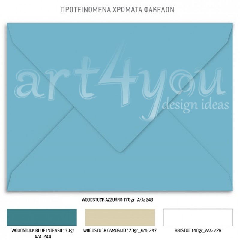 Το προσκλητήριο διαθέτει φάκελο διάστασης 19,5x14,5cm σε χαρτί της επιλογής σας από τους αναγραφόμενους κωδικούς.