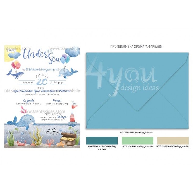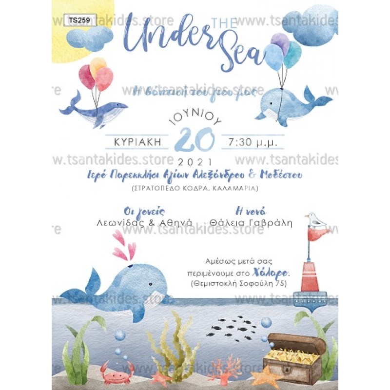 Προσκλητήριο βάπτισης για αγόρι με θέμα τη θάλασσα και το μικρό φαλαινάκι.
