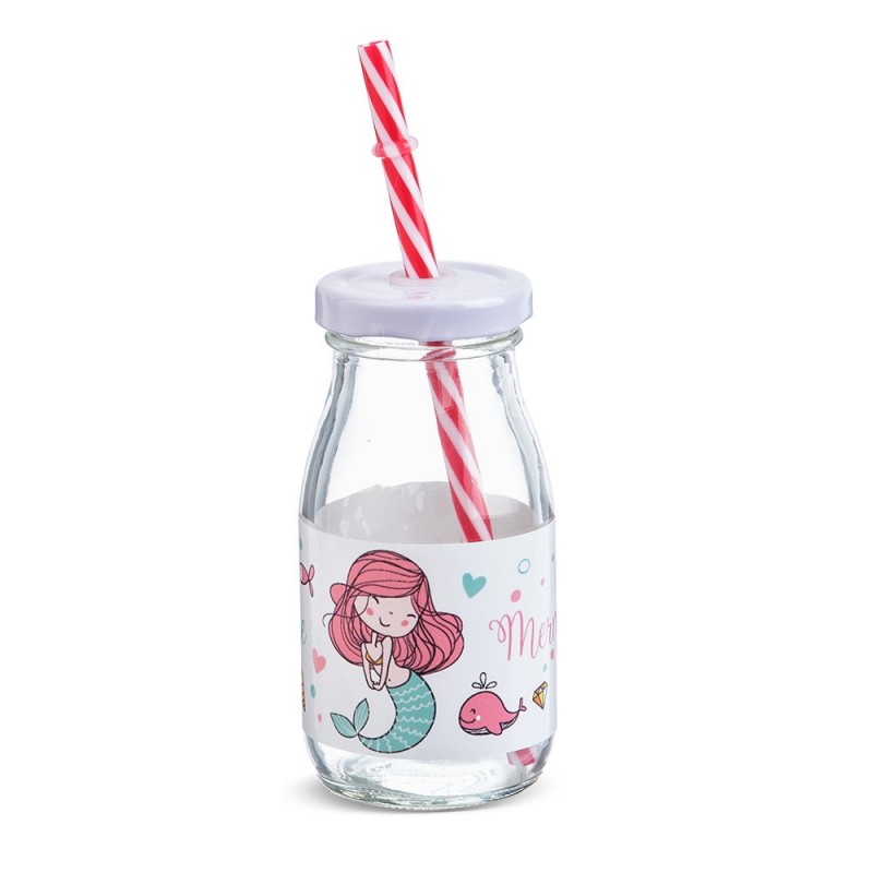 Συνοδεύεται από πολύχρωμα καλαμάκια. Είναι διακοσμημένο με αυτοκόλλητο print Γοργόνα.