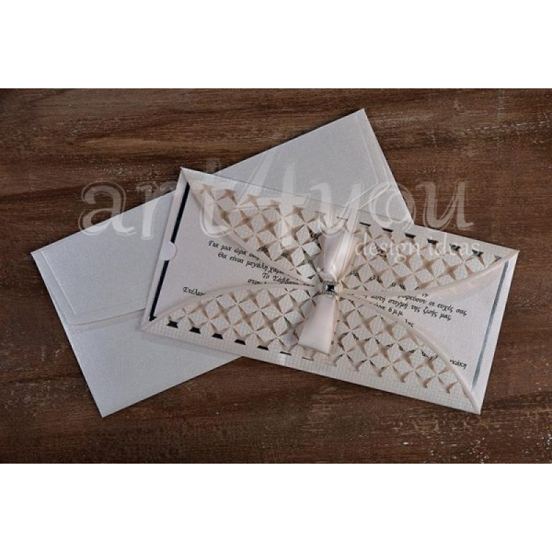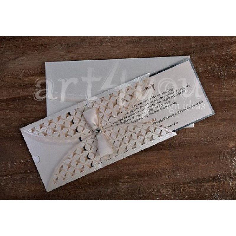 Το προσκλητήριο διαθέτει φάκελο διάστασης 22×11cm σε εκρού περλέ χαρτί